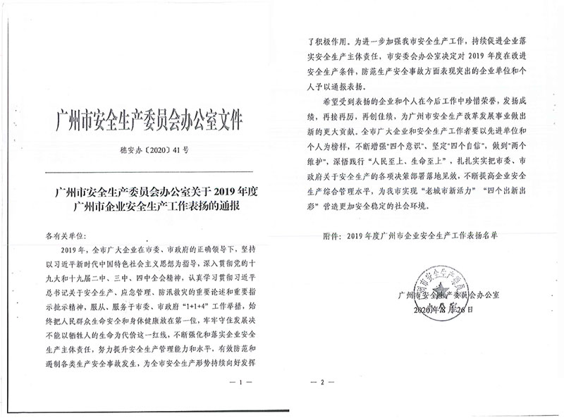 本次能获广州市安全生产委员会办公室通报表扬,是对我集团安全生产工作落实执行的认可,也是对我集团安全生产管理制度的专业褒奖,我集团将以此通报为勉,戒骄戒躁,继续完善现有工作中的不足之处,争取取得更好的成绩。